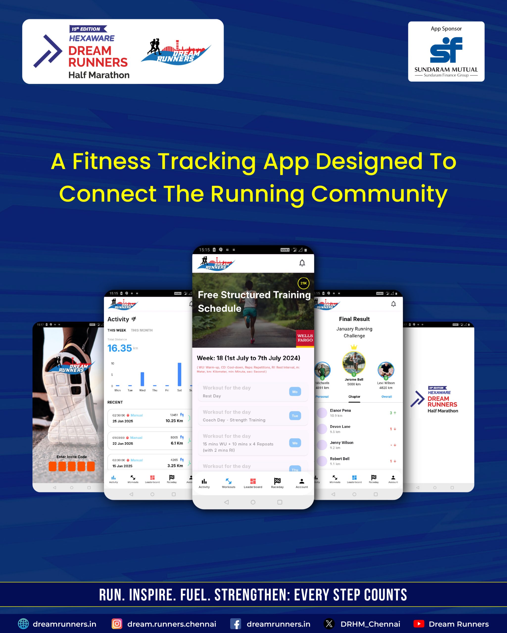 Dream Runners Fitness Tracking App, proudly sponsored by Sundaram Mutual. Whether you’re a seasoned runner or just getting started, this all-in-one app is designed to support, motivate, and connect our ever-growing running community as we train together for the 2026 Half Marathon.